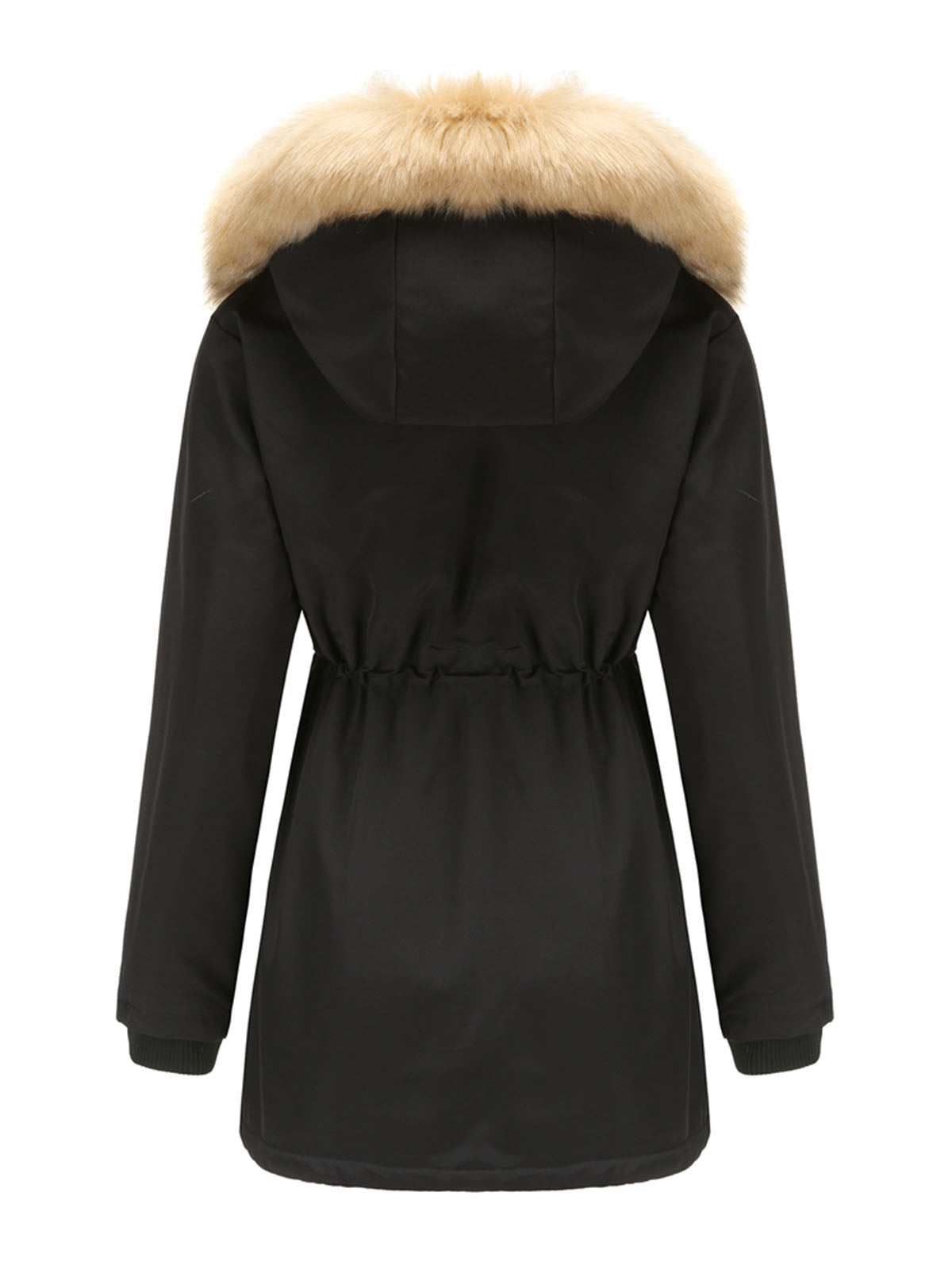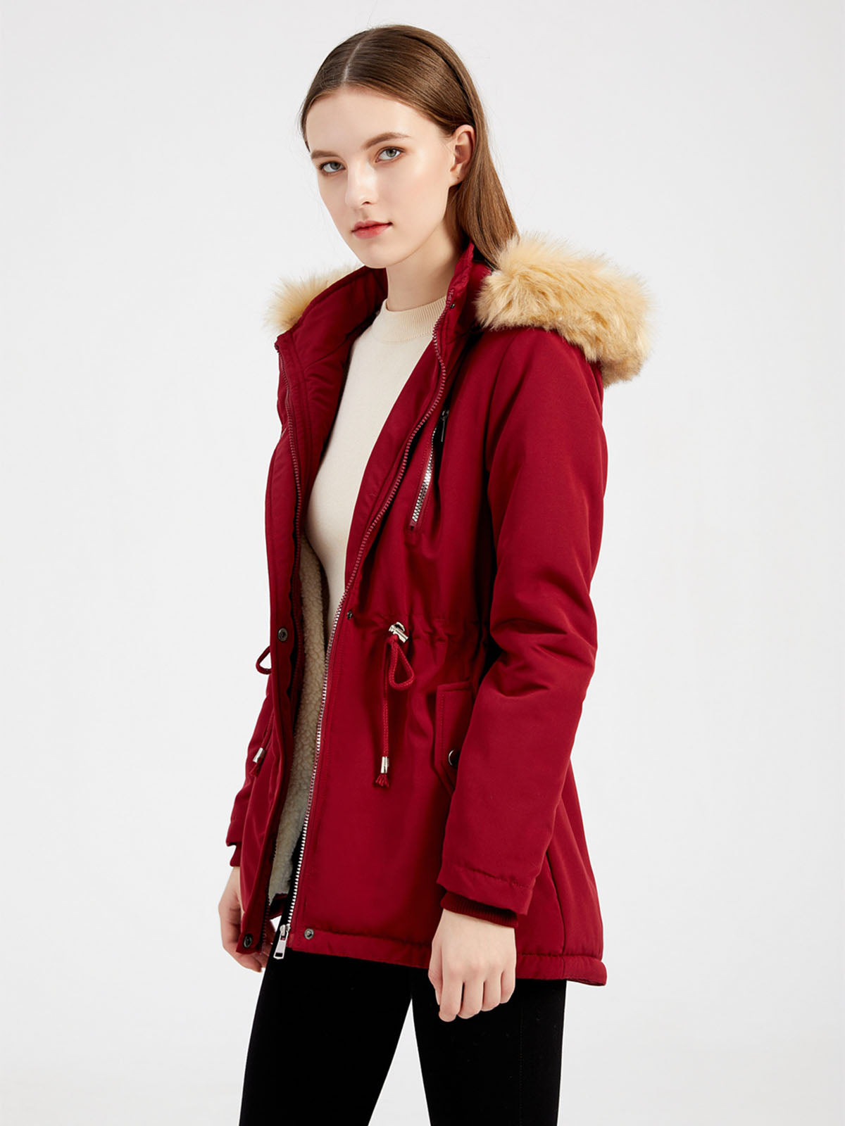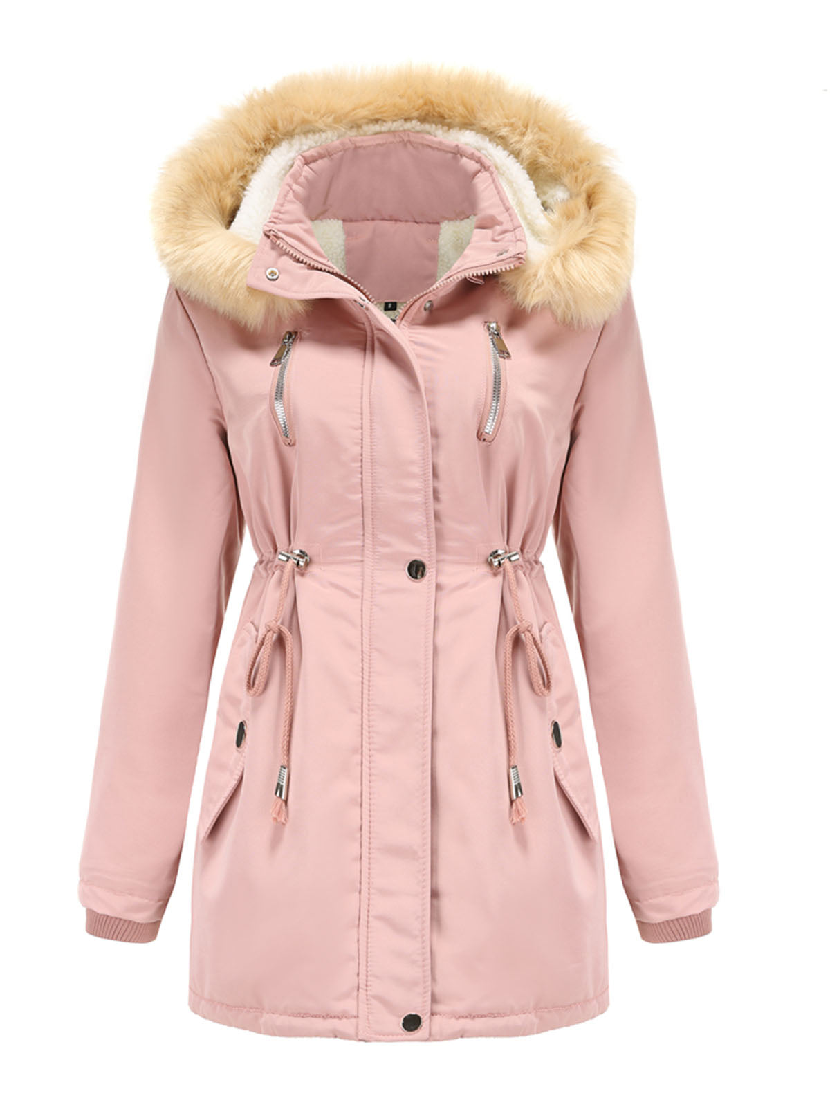 This hooded coat is designed with a soft faux fur trimmed hood and a structured outer layer that provides additional coverage. The front features a zipper with snap-button fastening, offering a secure and practical closure.