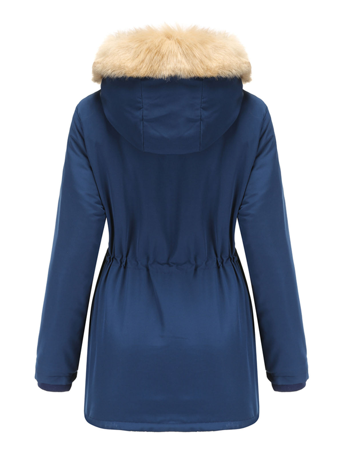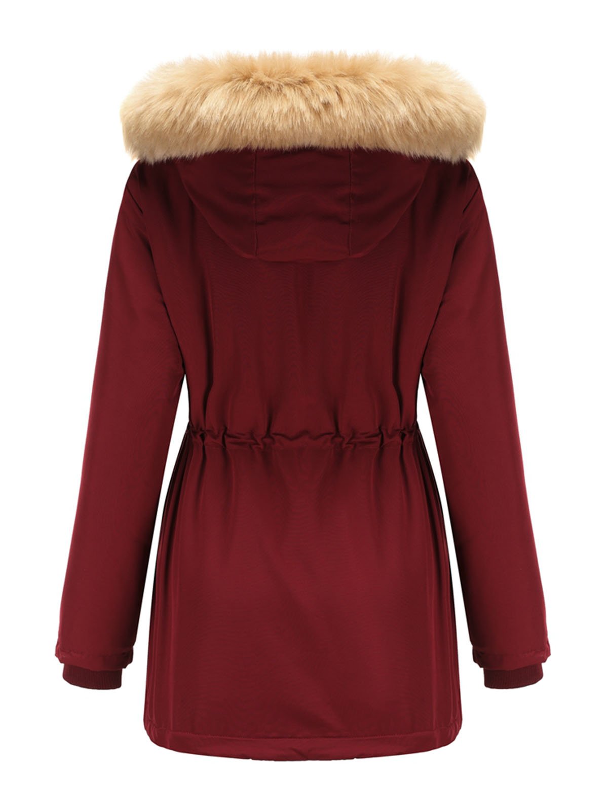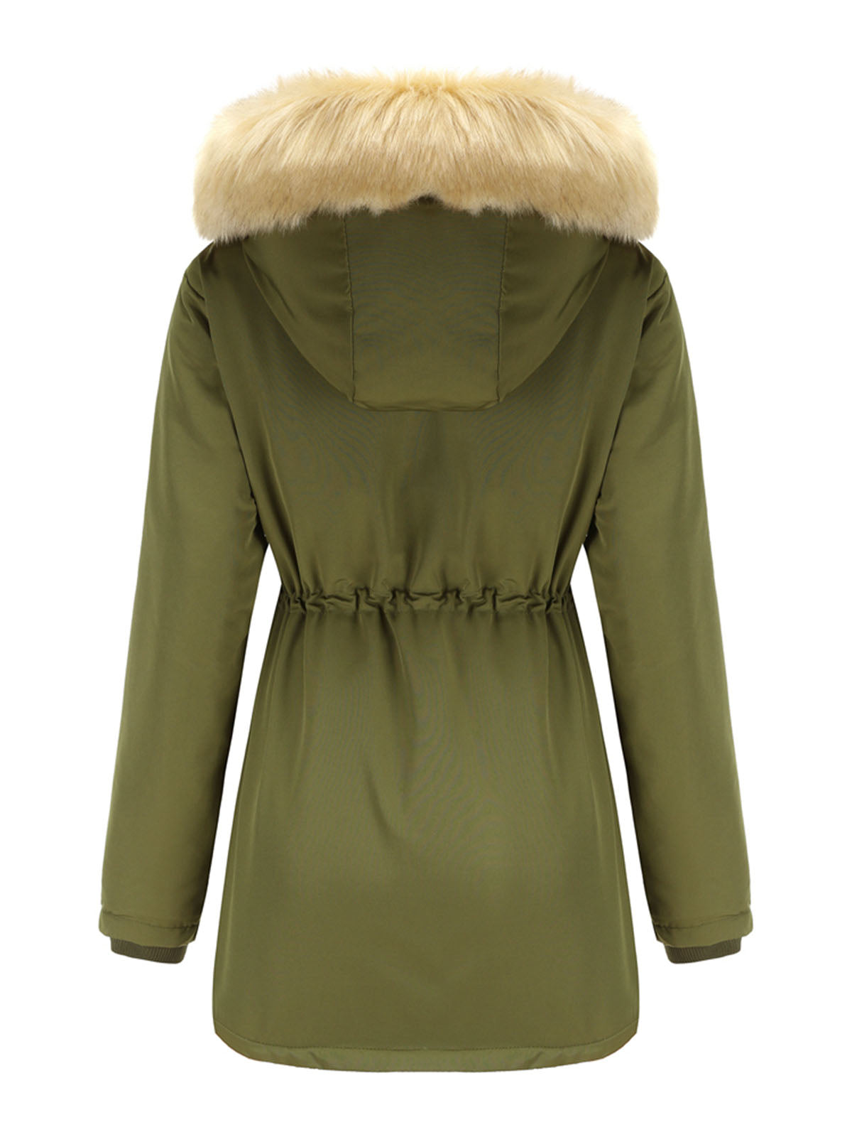 This hooded coat is designed with a soft faux fur trimmed hood and a structured outer layer that provides additional coverage. The front features a zipper with snap-button fastening, offering a secure and practical closure.