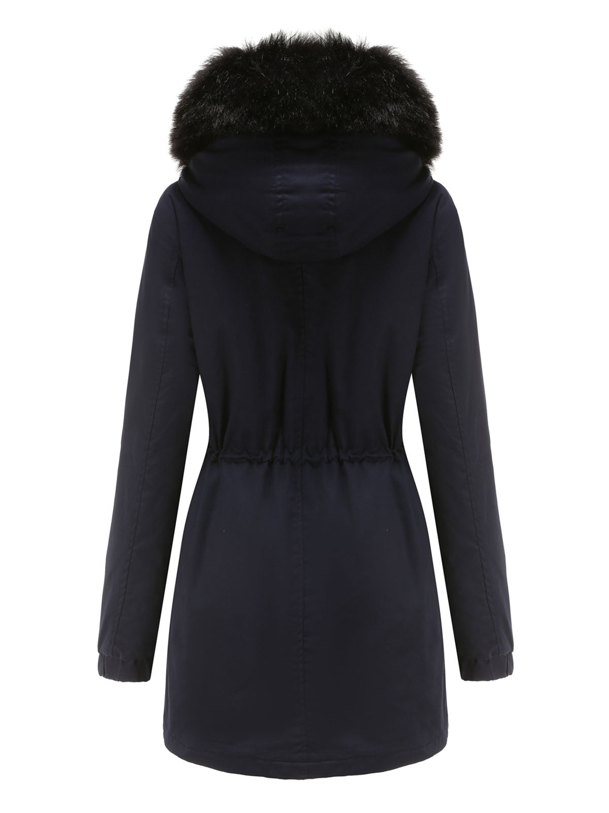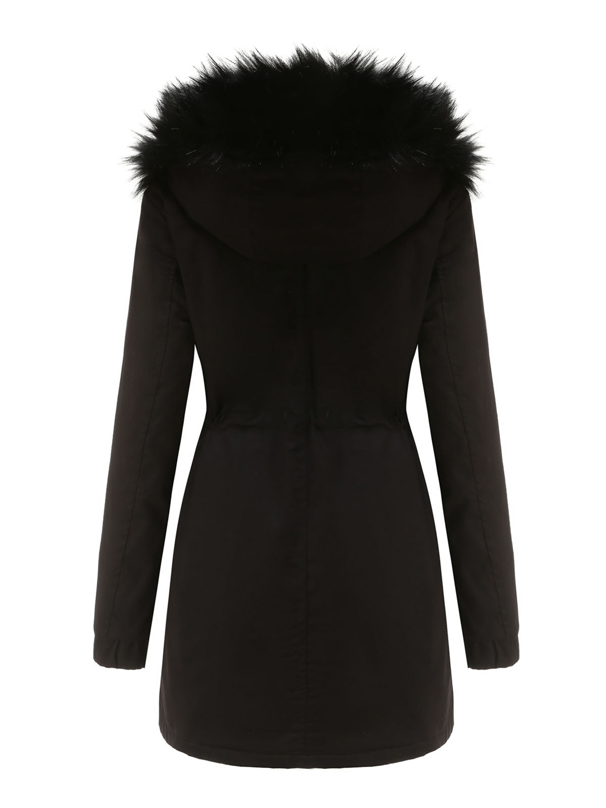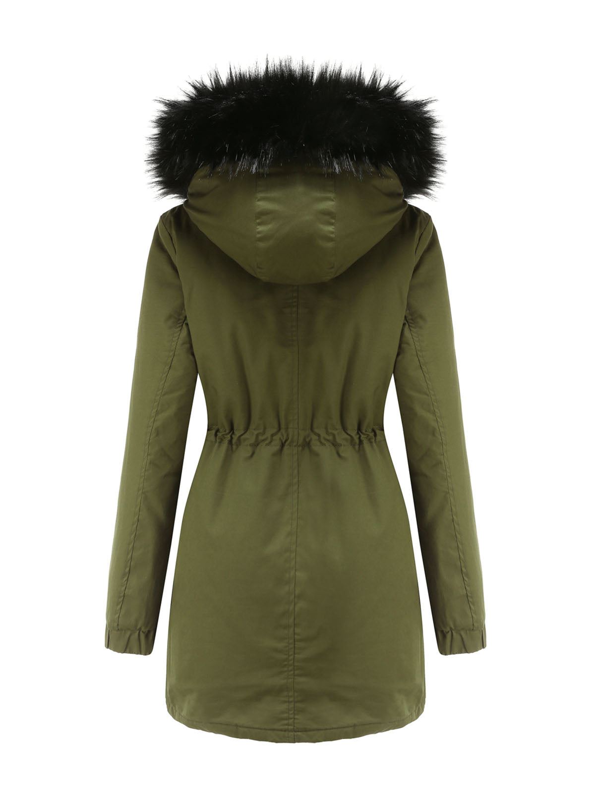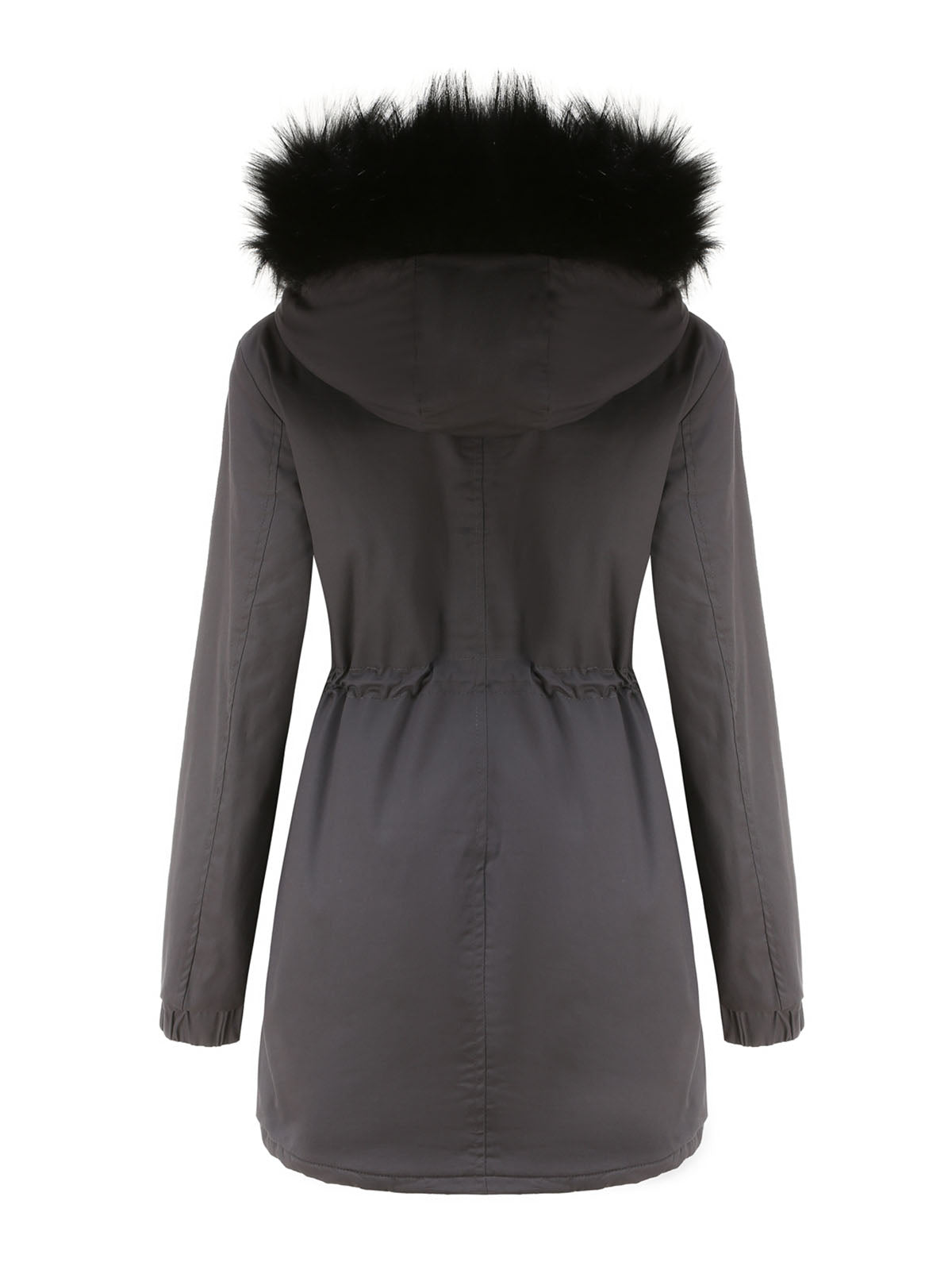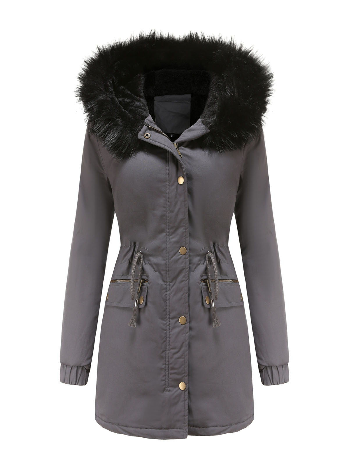 This hooded parka jacket features a practical design with a front closure and a protective hood finished with faux fur trim. The jacket includes multiple front pockets and an adjustable drawstring at the waist, allowing for a customizable and functional design.