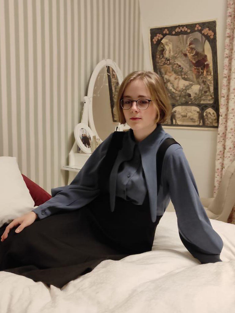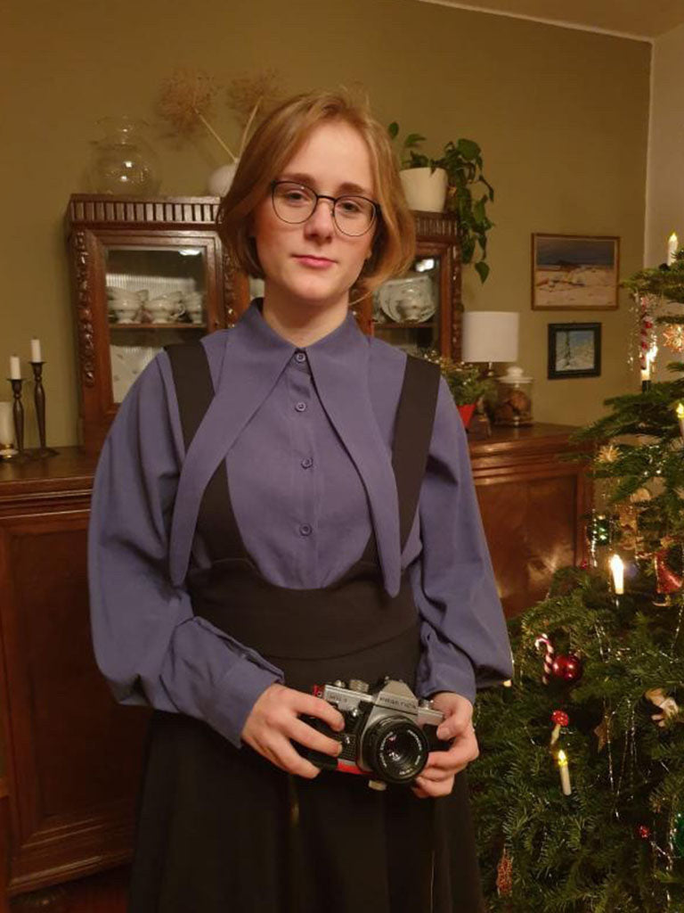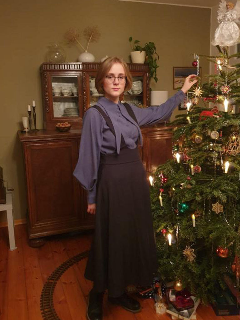From Boutique Susanne, this women’s dress features a layered design that combines a structured button-front top with a suspender-style skirt overlay. The upper section includes a classic collar and front button closure, while the long sleeves are finished with wide cuffs for a balanced silhouette.